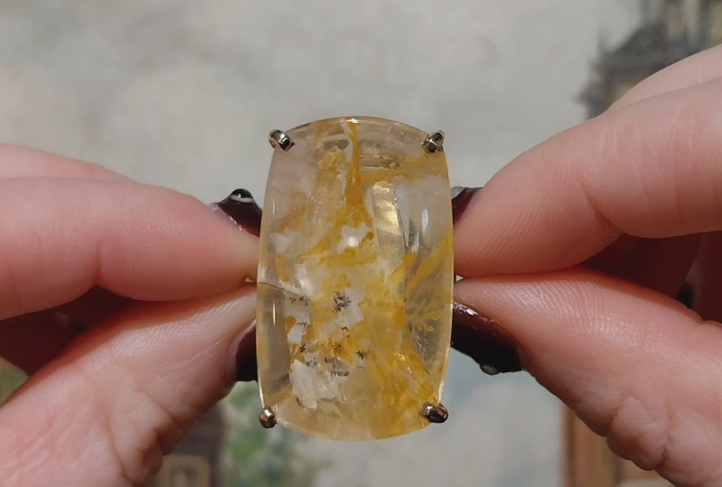 The rock crystal has mainly yellow natural cloudy veins running throughout the stone with a concentration of black speckles in one area. The ring and stone are in very good condition.