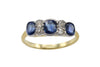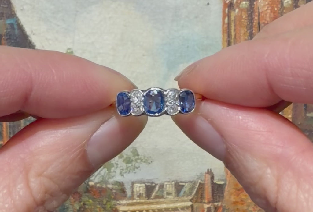 An Edwardian period 15 carat gold and platinum ring with three oval faceted blue sapphires and forur old cut diamonds.