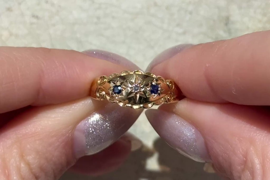 An 18 carat gold Edwardian period gypsy style ring with two sapphires and a rose diamond in star settings. The ring is hallmarked for the City of Chester and the year 1907.