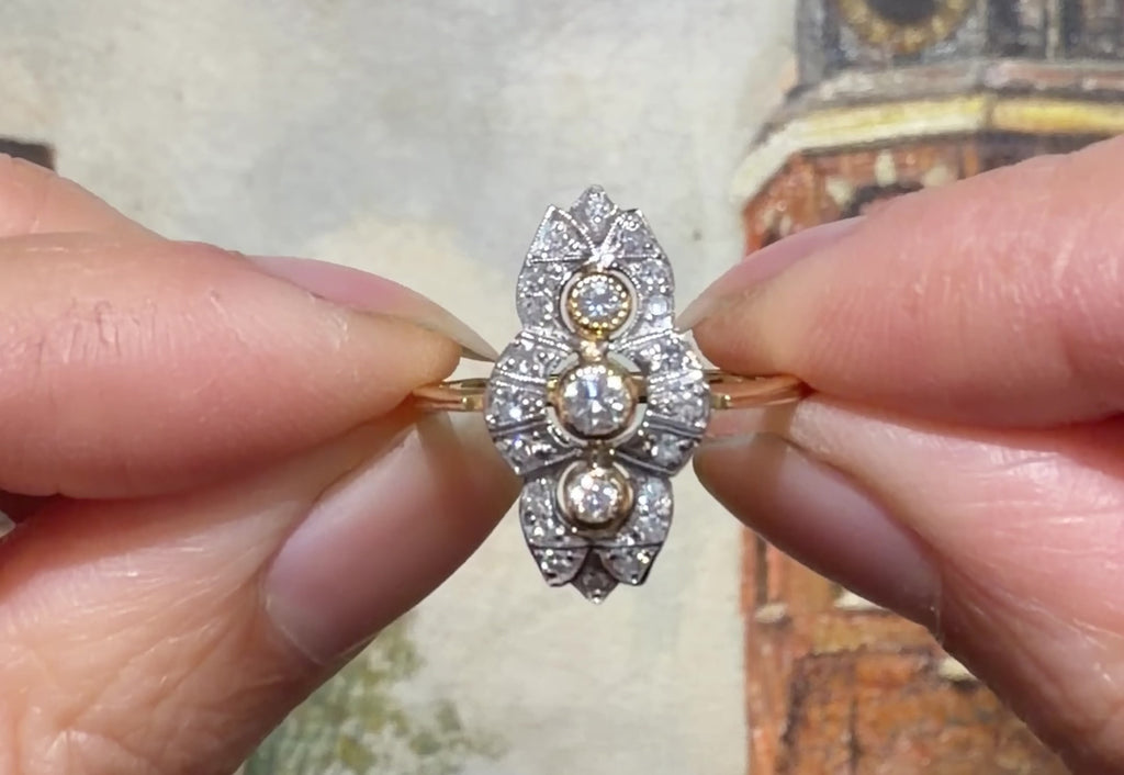A vintage 18 carat yyellow and white gold ring with brilliant and single cut diamonds in a navette shaped setting.