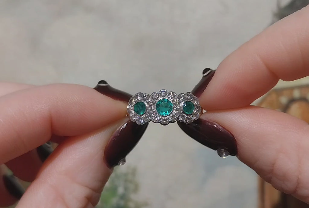 Vintage emerald and diamond triple cluster ring-engagement rings-The Antique Ring Shop
