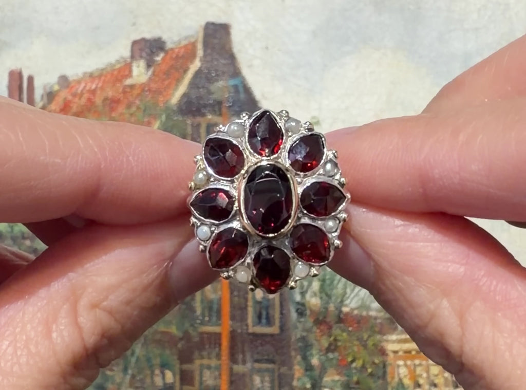 A vintage Dutch 14 carat gold and silver ring with eight drop shaped garnets, and oval garnet and eight seed pearls.