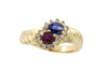 A rare 18 carat gold ring with an intertwined sapphire, ruby and diamond cluster.