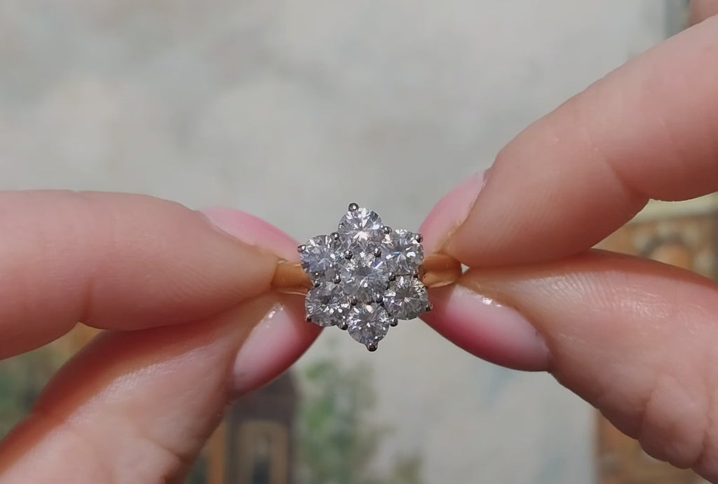 A vintage 18 carat yellow and white gold ring with seven brilliant cut dimaonds in a classic flower head style cluster setting.