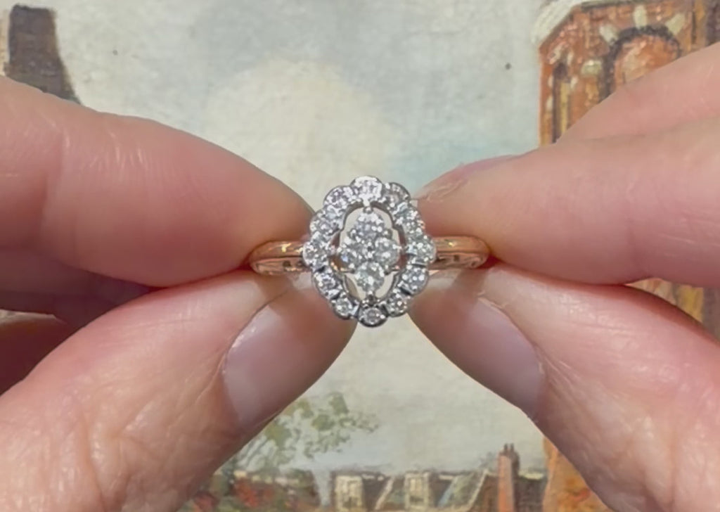 A vintage 14 carat yellow and white gold ring with 16 brilliant cut diamonds in an open navette style cluster setting. The ring is hallmarked for the City of Birmingham and the year 1988.