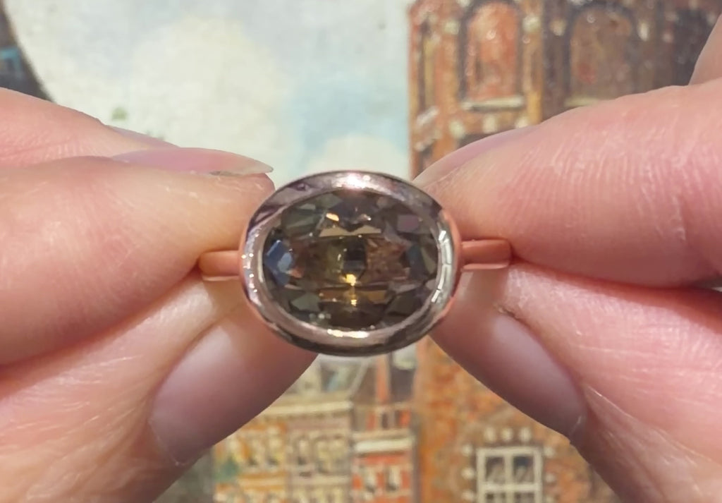De rookkwarts is 10 mm x 8 mm groot en weegt 2 karaat. De ring weegt 6 gram.