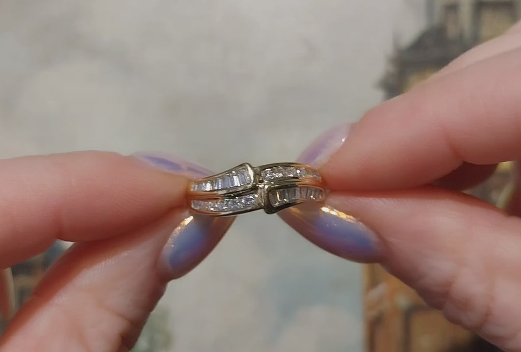 De ring is ontworpen met een aantrekkelijke overgang tussen de baguette en briljant geslepen diamanten. De ring verkeert in goede algehele staat.
