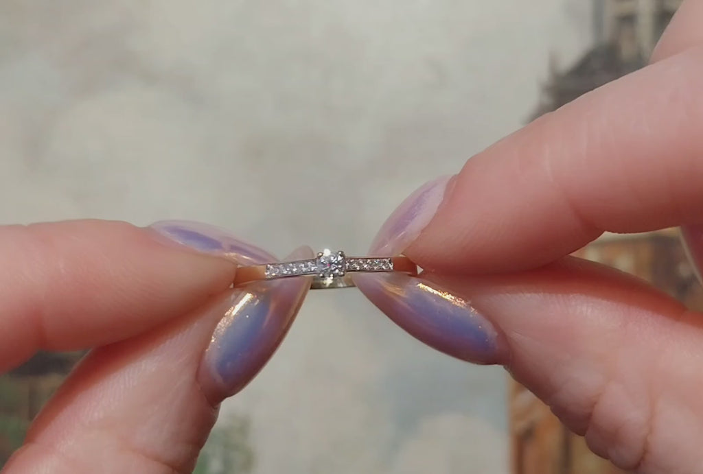 Tien van de diamanten zijn gezet in de schouders van de ring, de grootste diamant is in een klauwzetting in het midden geplaatst. De diamanten hebben een totaal gewicht van 0,21 karaat, VS kwaliteit en H kleur.