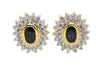 The bezel set sapphires measure 5 mm by 3 mm and are around .70 carat in total. The 72 brilliant cut diamonds are .90 carat in total, VS in quality and H in color. The oval studs measures 14 mm by 13 mm and weigh 7 grams together.