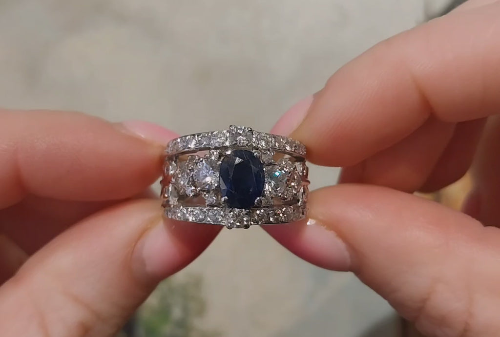 De saffier meet 7,5 mm bij 5,5 mm en is ongeveer één karaat. De diamanten zijn voornamelijk briljant geslepen, met een paar enkel geslepen diamanten. Het totale karaat gewicht van de diamanten is 1,20. De diamanten hebben een VS tot SI2 kwaliteit en een H kleur. De ring weegt 8,3 gram.