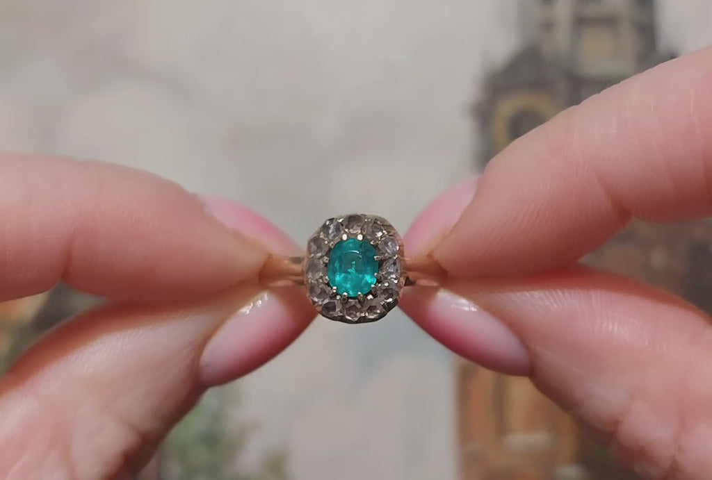 Een antieke 14 karaat gouden ring met een smaragd omringt door 12 roosdiamanten.
