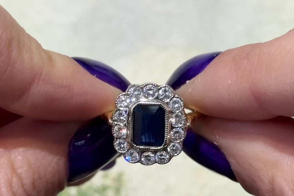 A classic vintage 18 carat gold ring with a faceted rectangular sapphire and 14 brilliant cut diamonds.