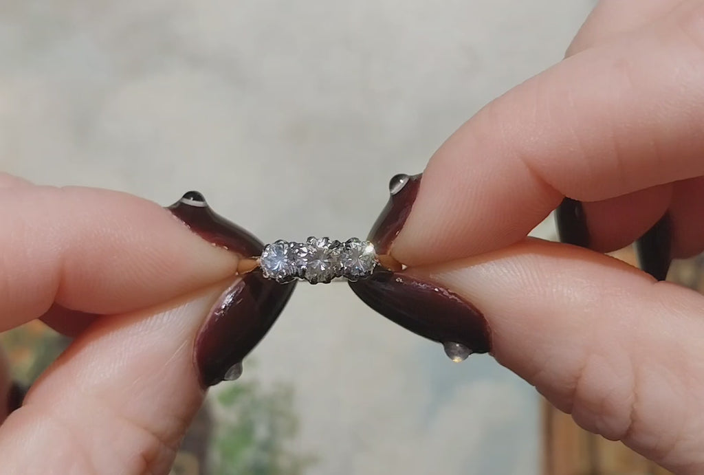A vintage18 carat white and yellow gold ring set with three swiss cut diamonds.