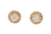 A pair of 18 carat gold ear studs with brilliant cut diamonds. Each piece has a raised cluster of 13 diamonds with an outer halo of 18 smaller diamonds.