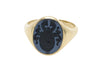 The oval layered stone measures 12.4 mm by 10.5 mm and is engraved with a family crest. The ring weighs 6.4 grams.